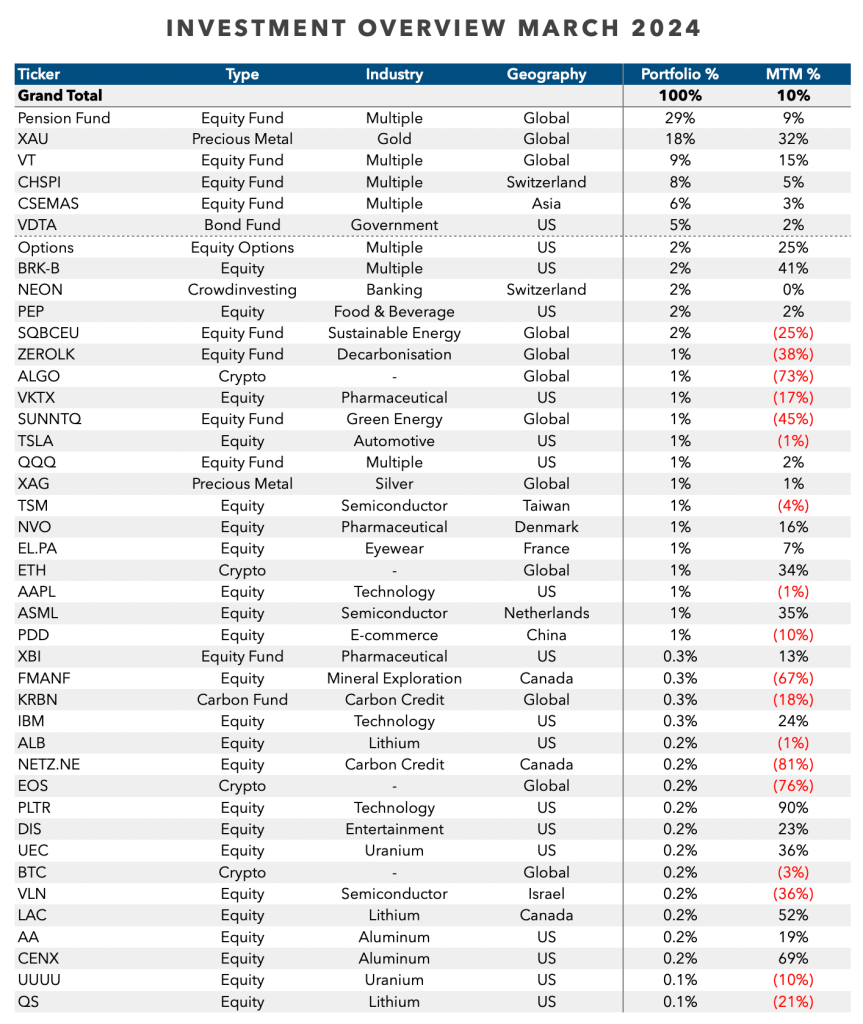 As promised in last week’s post, I am sharing with you an overview of my investment portfolio and how it’s shaping up as of March 2024. My aim is to provide monthly updates so you can see how my portfolio evolves over time and gather insights from my experiences along the way.